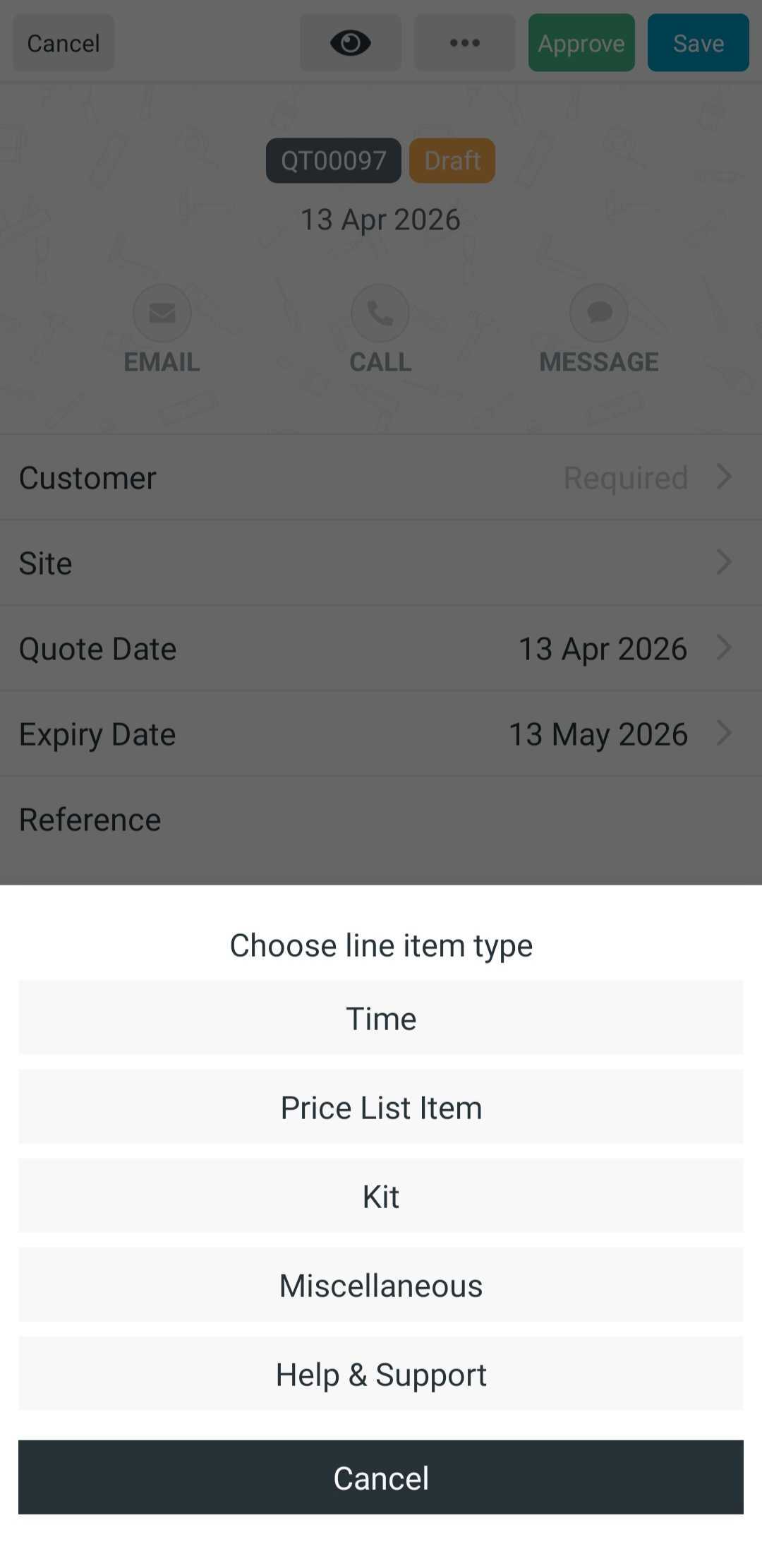 - Search for and select the draft Quote you want to add an item to or create a new quote.