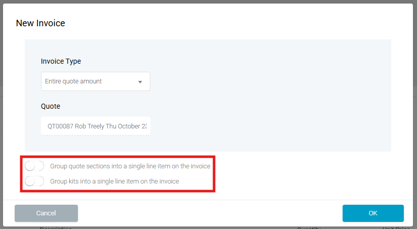 | Line items in quote | To Invoice only selected items on the quote, e.g. For pre-charging material items, or select high value/risk items, etc. |