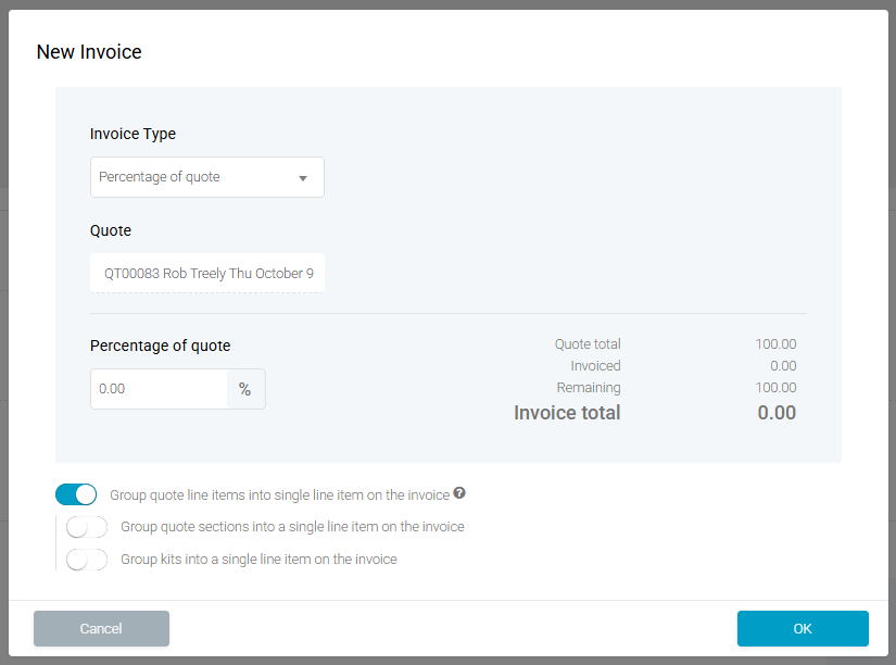 | Percentage of quote | To Invoice a specific percentage of a quote, e.g. For deposits, payment plans, etc. |
