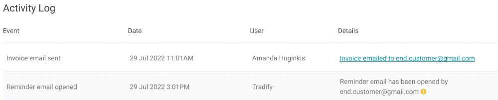 1. In the activity log, locate the events related to email communication, such as "Invoice email sent," "Quote email sent," "Job email sent," or "Form email sent."