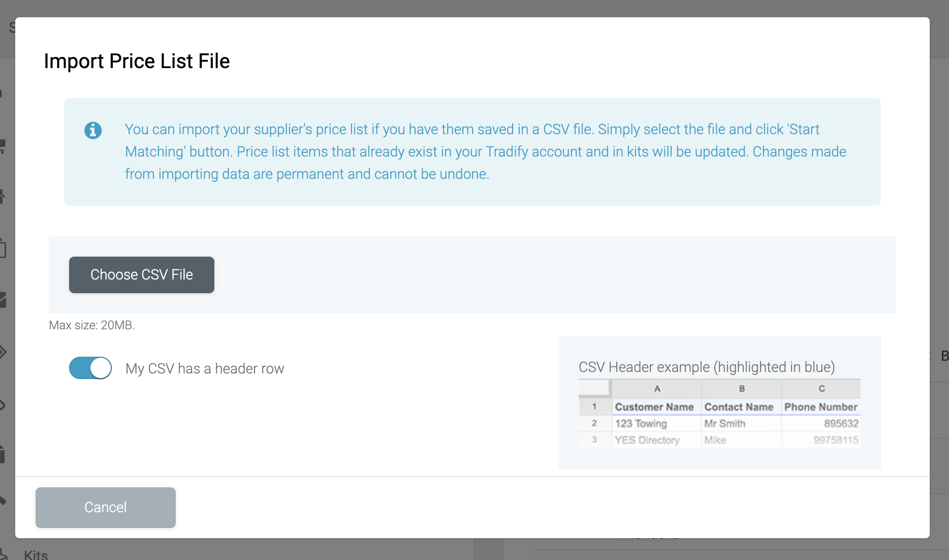 Learn more about importing a supplier Price List on Tradify from a .CSV file, and what you'll need to get started. Price List Items are a list of commonly used materials or services that can easily be added to Jobs, Quotes, Invoices, Bills and Purchase Orders at the click of a button.