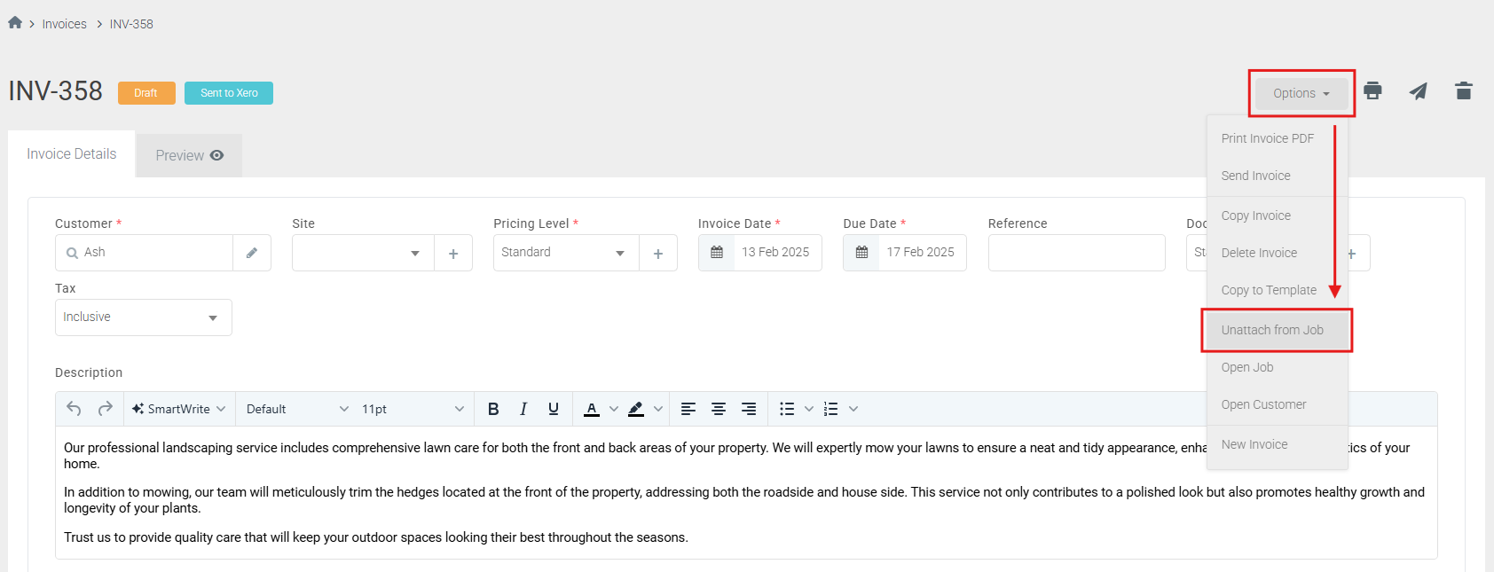 Note: Once Unattached from the job, you can then attach this invoice to a new Job by selecting Options > Attach to Job.