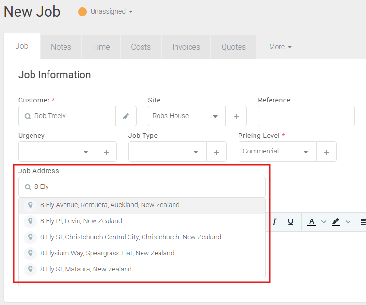 - Adding a customer to a job pulls the main address from their profile to fill the job address.