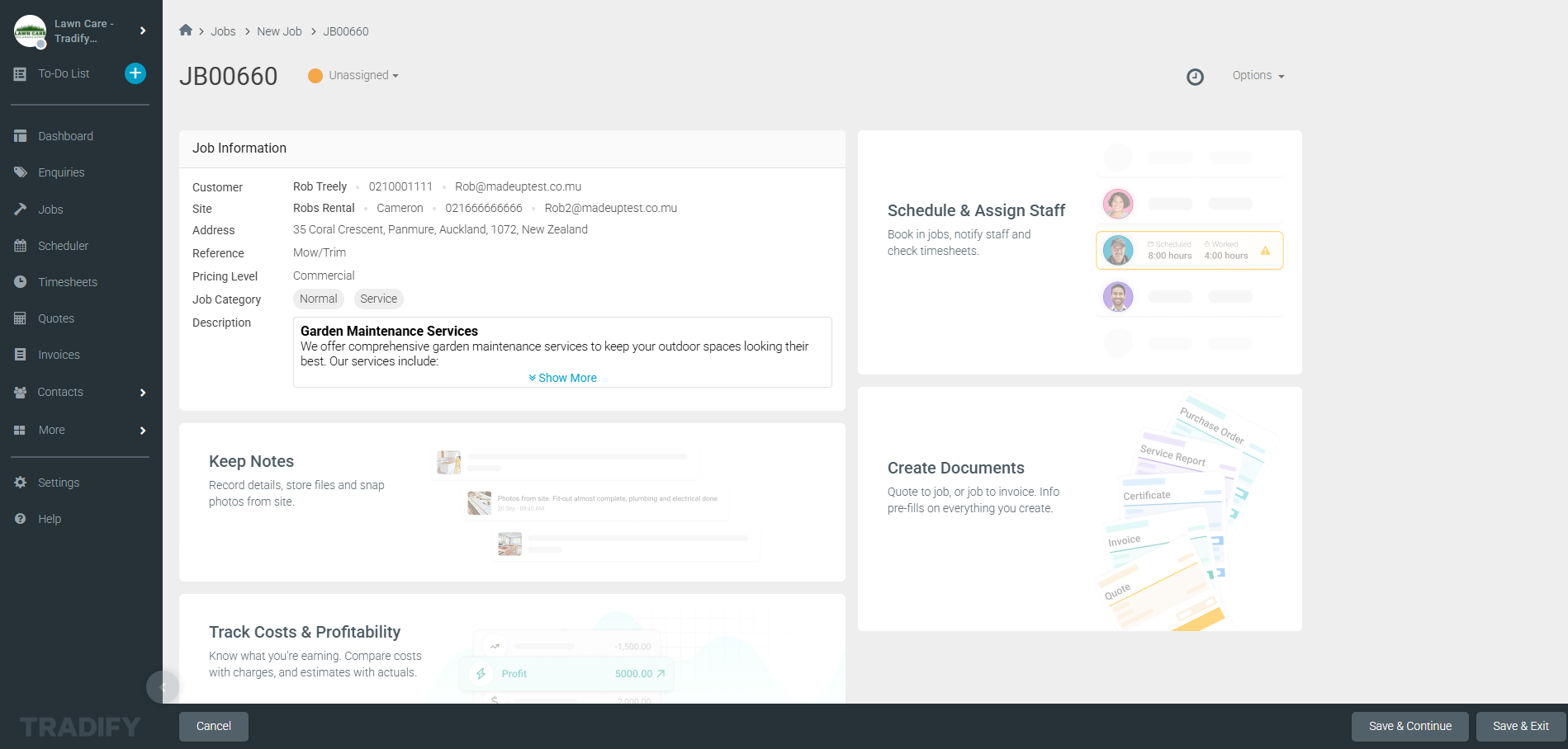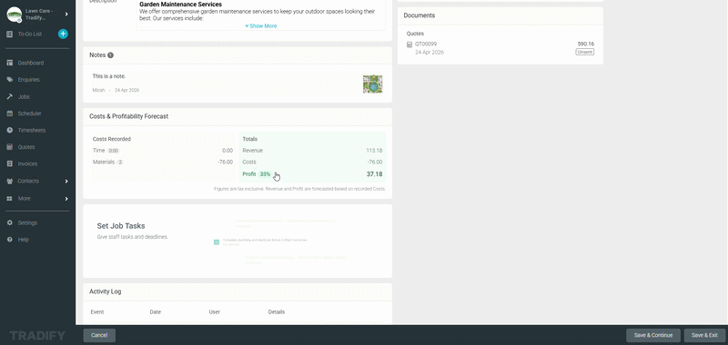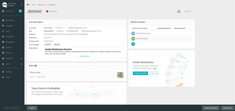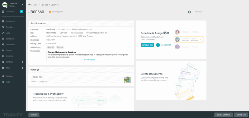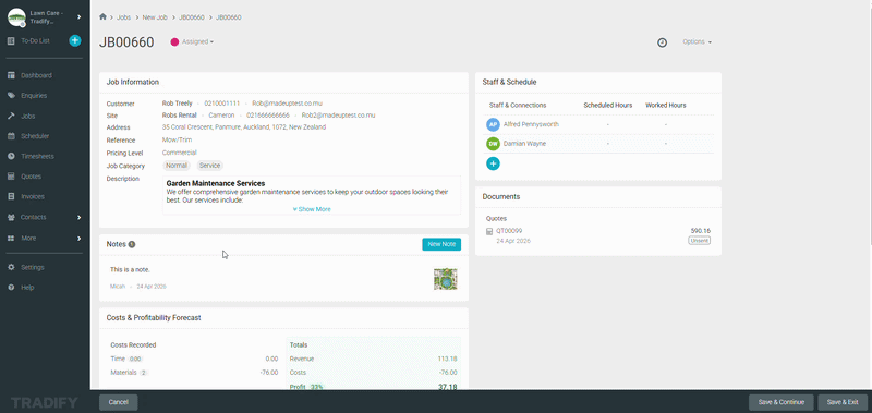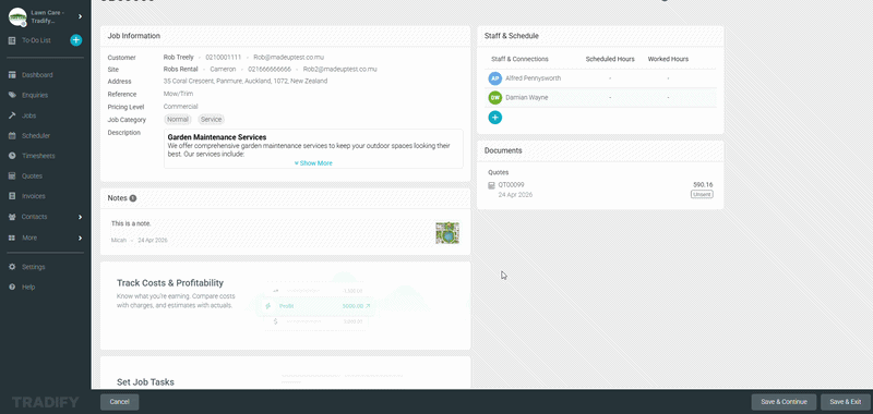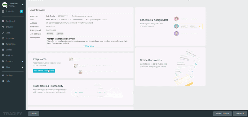 Tradify's new Job Card Dashboard combines all the tabs into one easy-to-use overview page, allowing you to manage your job tasks like creating documents, entering timesheets, adding notes, and more, all in one place.